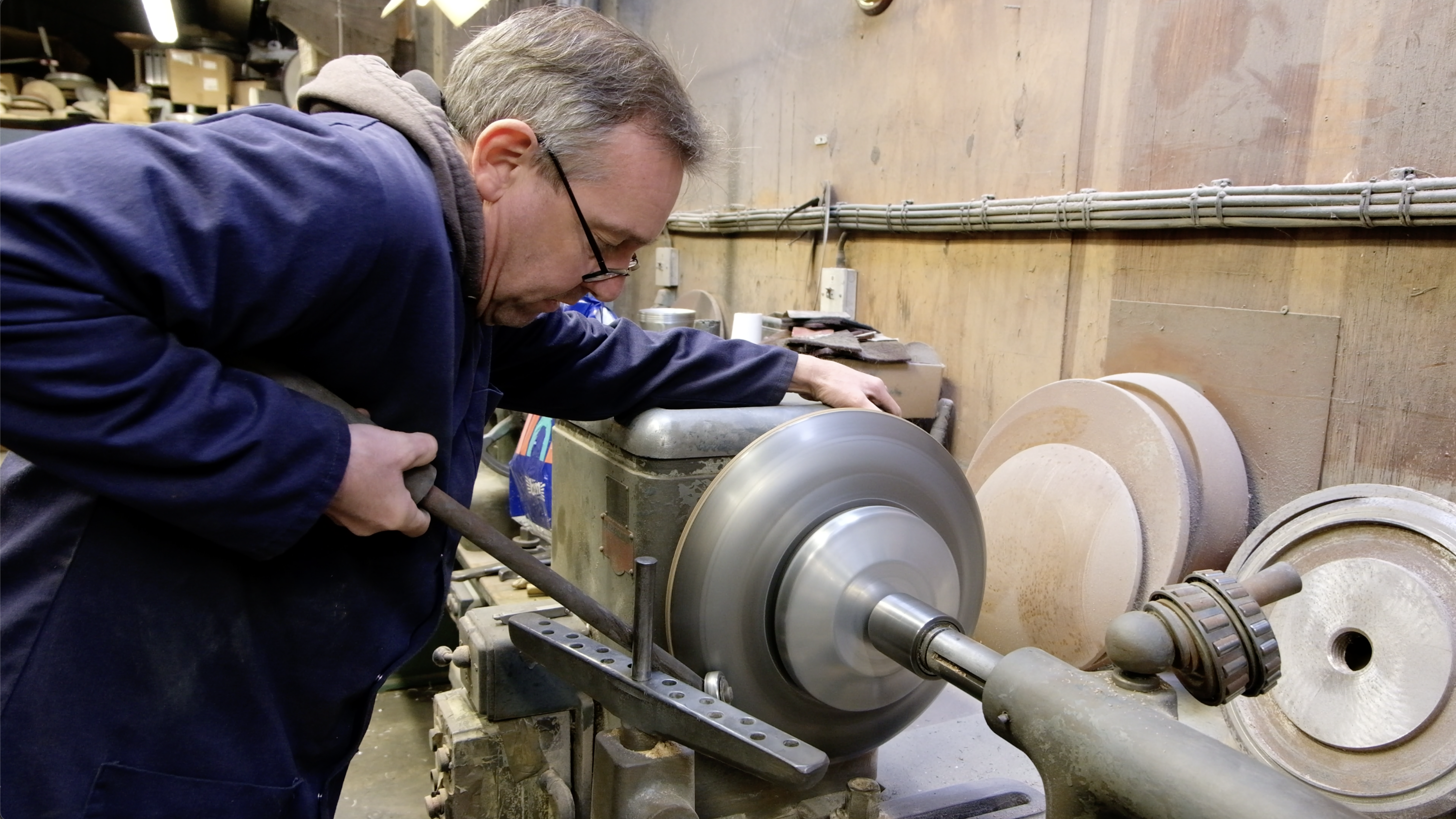 The shade is spun from steel by Gary, a 3rd generation metal spinner based in in Uxbridge. The tubing, cut from seamless steel tubing in Norfolk was welded and finished by hand and sealed to protect against liquids.