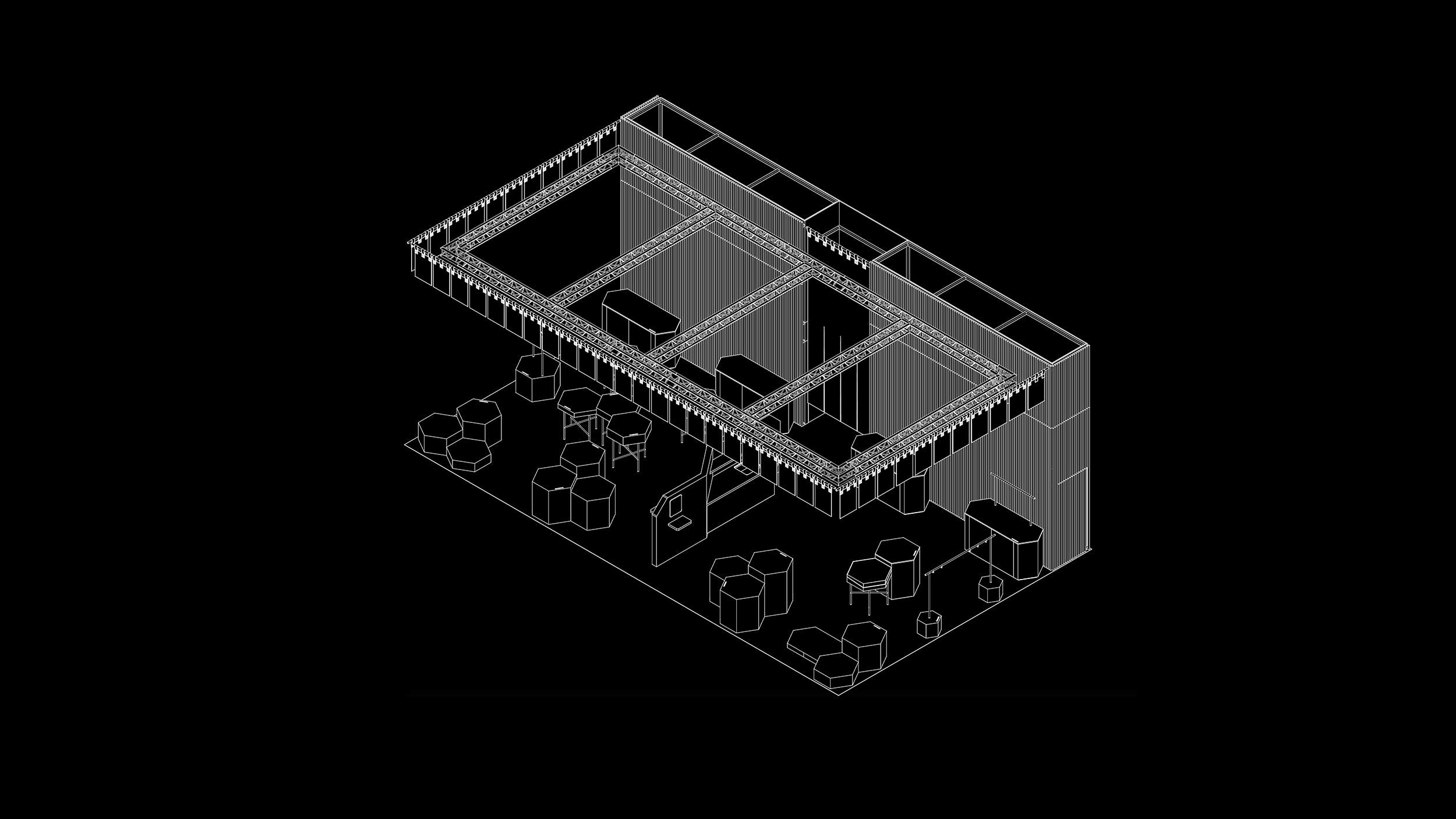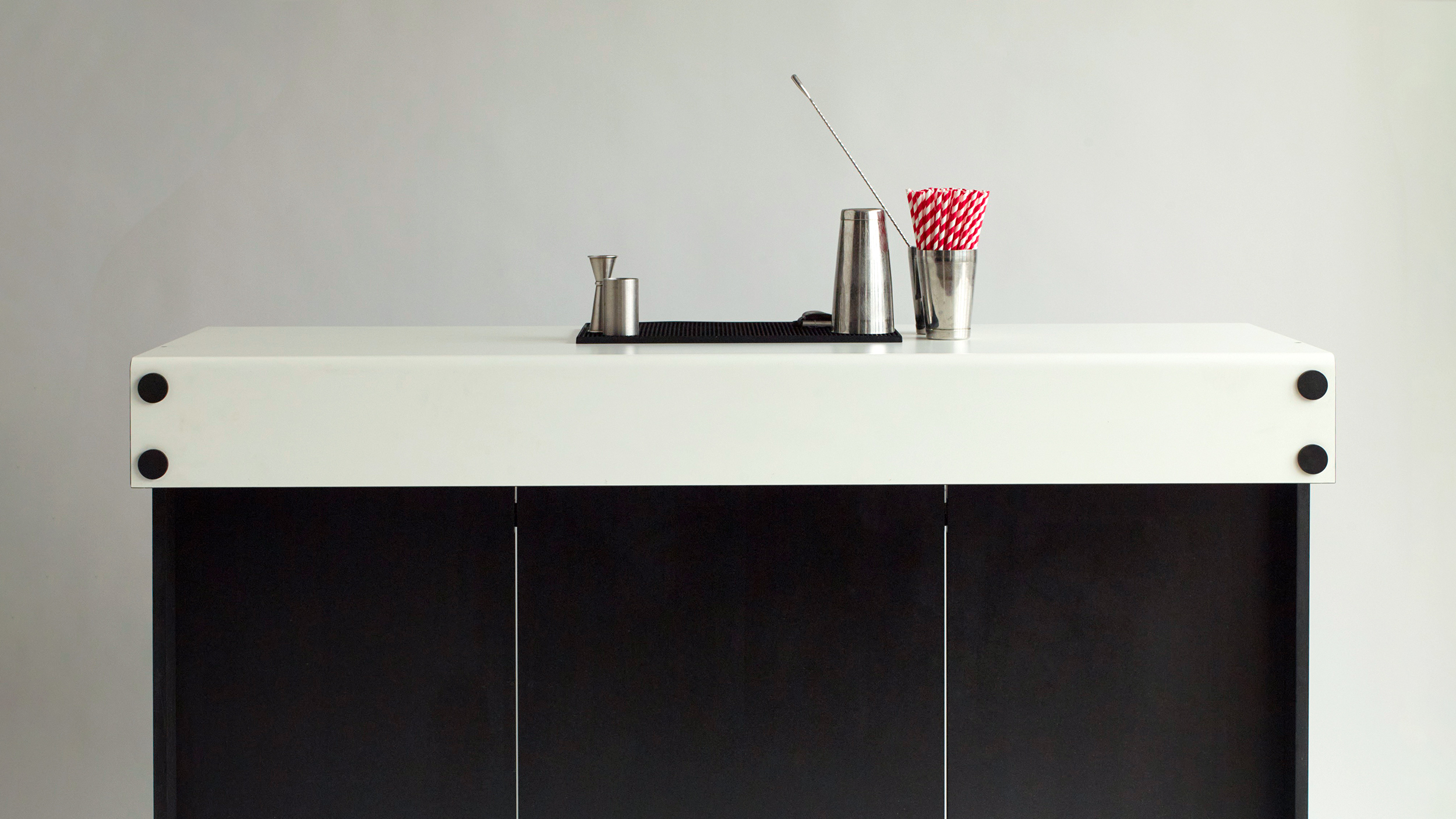 “A visually neutral continuous stackable unit that has two states, a bar or DJ booth. Can be carried by two people. Can be set up in under two minutes without instructions. Physically strong, waterproof and can withstand a beating.”