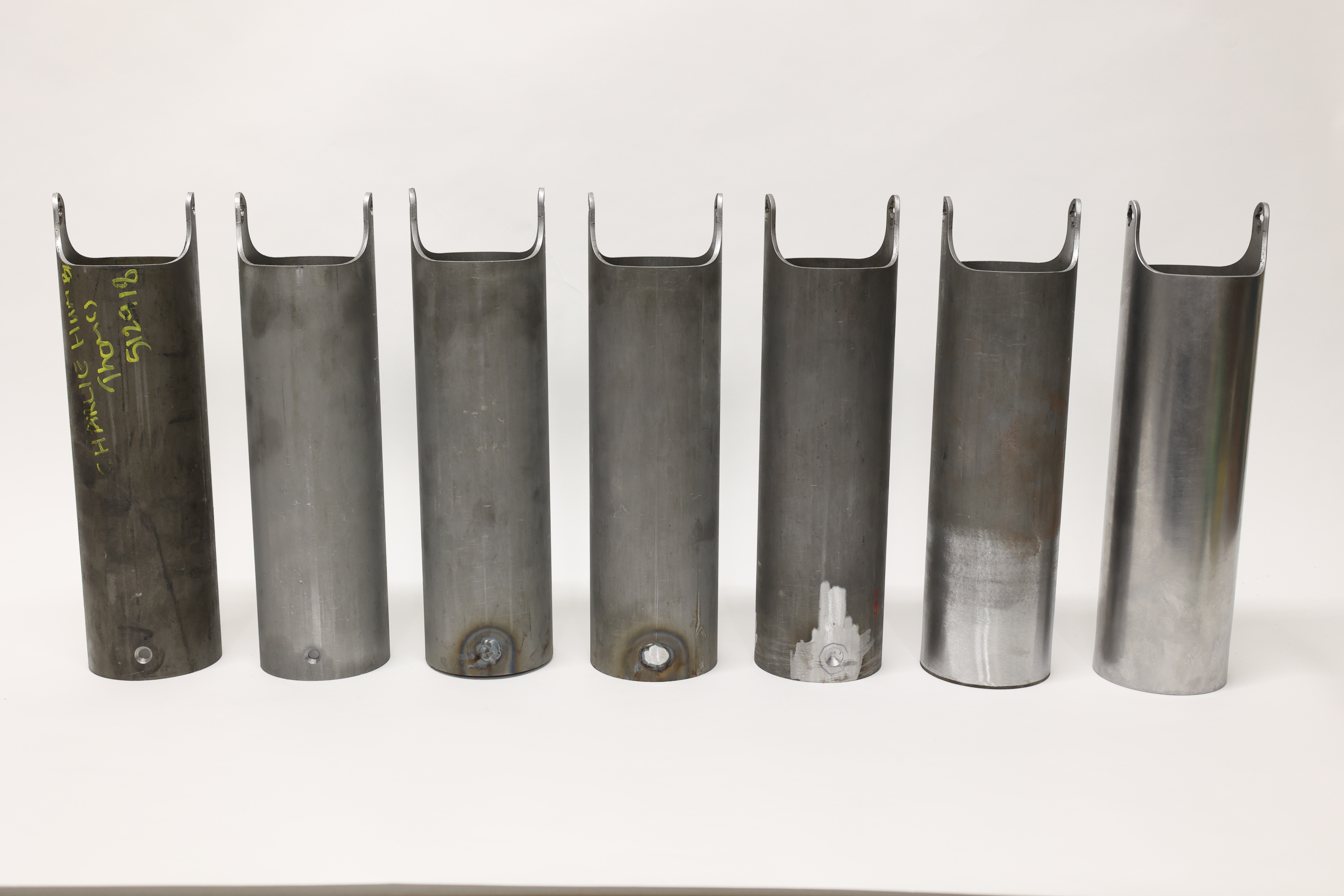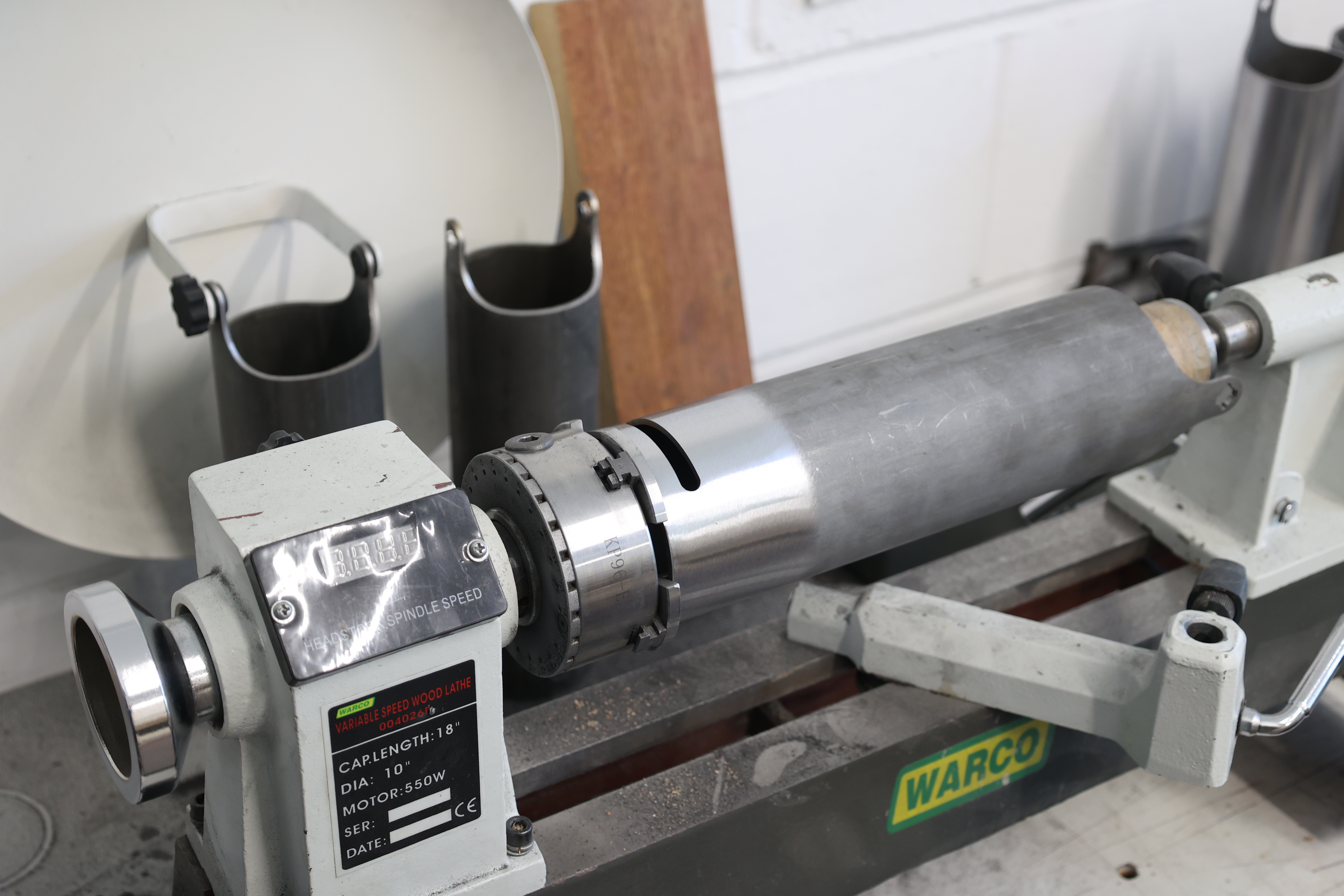 The shade is spun from steel by Gary, a 3rd generation metal spinner based in in Uxbridge. The tubing, cut from seamless steel tubing in Norfolk was welded and finished by hand and sealed to protect against liquids.